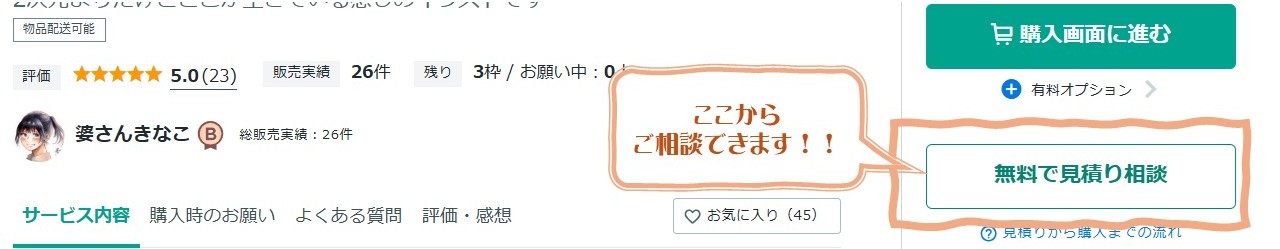 ご依頼前に右側の【無料で見積相談】にてご相談いただけます。ご希望に沿ったイラストをお届けするためにもぜひ事前にご相談ください!